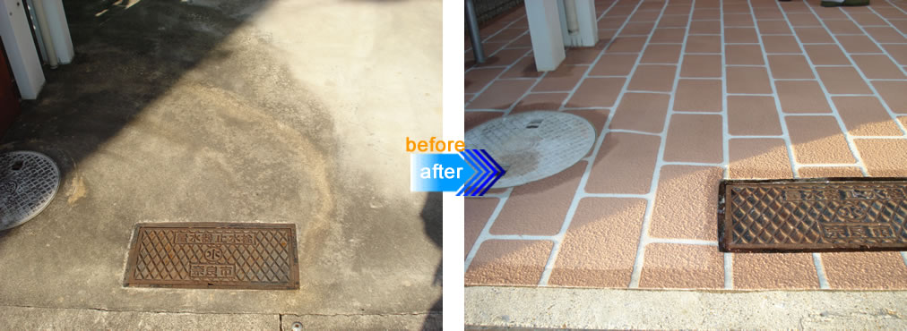 エントランス、アプローチ、滑りやすい箇所などに一日施工で進めます。将来的に上から再施工も簡単です。