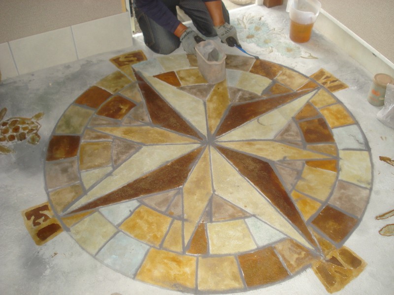目地カラー施工まではステンシル工法と同じです、乱形石、石畳、ウッド柄は専用テープで形どり、ご近所に無い作品をお創りいたします。[P-28コンパスなどは使用します]
